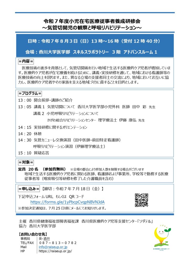 「令和7年度小児在宅医療従事者養成研修会~気管切開児の観察と呼吸リハビリテーション~」のお知らせ