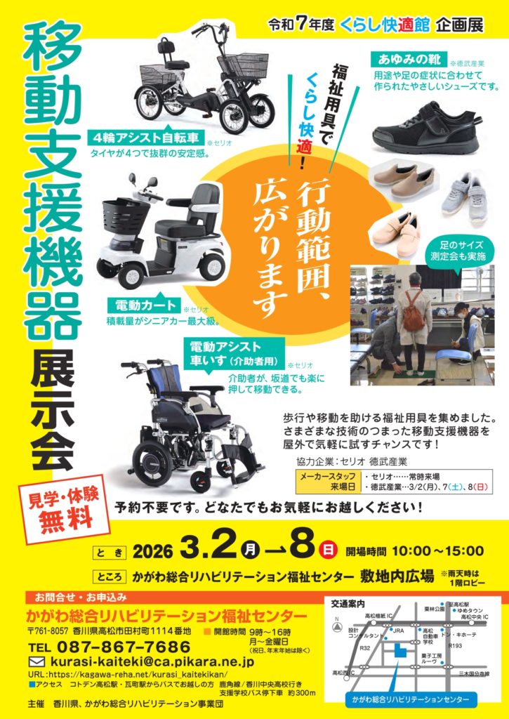 令和7年度 くらし快適館 企画展のお知らせ 2026年2月19日 最終更新日時 : 2026年2月19日 ソダテルスタッフ かがわ総合リハビリテーション福祉センターより、「令和7年度 くらし快適館 企画展 移動支援機器展示会」のお知らせです。歩行や移動を助ける福祉用具を集めました。さまざまな技術のつまった移動支援機器を屋外で気軽に試すチャンスです! 日時:2026年3月2日(月)~8日(日)10:00~15:00場所:かがわ総合リハビリテーション福祉センター 敷地内広場(雨天時は1階ロビー)※予約不要 詳細はパンフレットをご覧ください。 パンフレットダウンロードはこちら↓から 企画展チラシダウンロード